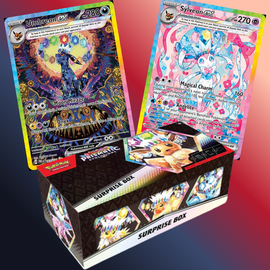 The Pokémon TCG: Scarlet & Violet—Prismatic Evolutions Surprise Box includes: