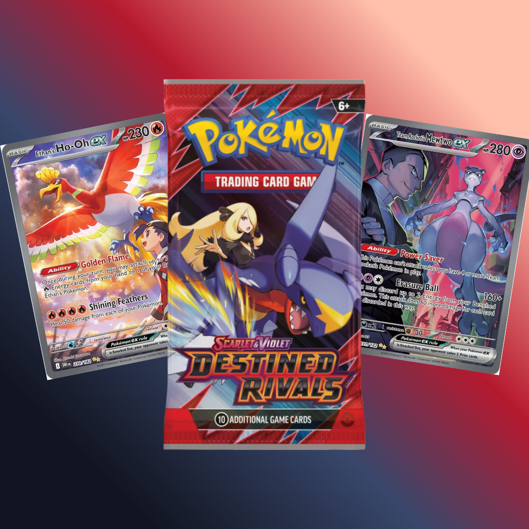 Pokémon Trainers, be on high alert! The nefarious Team Rocket is setting its latest plan into motion, and heroic Trainers are racing to stop it. Join forces with the likes of Cynthia and Garchomp ex, Ethan and Ho-Oh ex, or Arven and Mabosstiff ex… Or reconsider your loyalties and fight alongside Team Rocket’s Pokémon like Mewtwo ex—under the command of Giovanni! Choose a side, assemble your allies, and battle boldly in the Pokémon TCG: Scarlet & Violet—Destined Rivals expansion!
